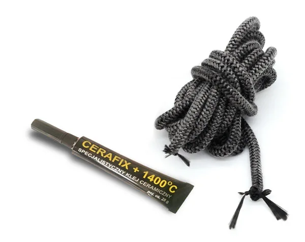 W skład zestawu naprawczego wchodzą – sznur Ø 6 mm o długości 2,5 metra bieżącego + klej żaroodporny (oporny do 1400°C), ceramiczny, o pojemności 28 gramów.